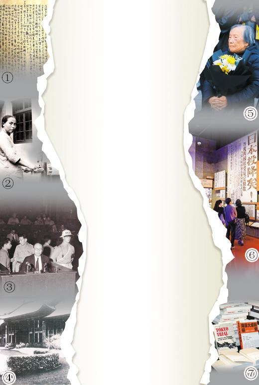 图①:程瑞芳日记。 图②:在金陵女子文理学院避难的妇女正在学习纺线。 图③:许传音在远东国际军事法庭...